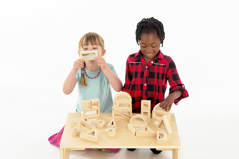 24 fascinating smooth tactile rubberwood shapes with double-sided reflective acrylic mirror inserts. Made to promote simple shape recognition, early tactile hands-on construction and curiosity.