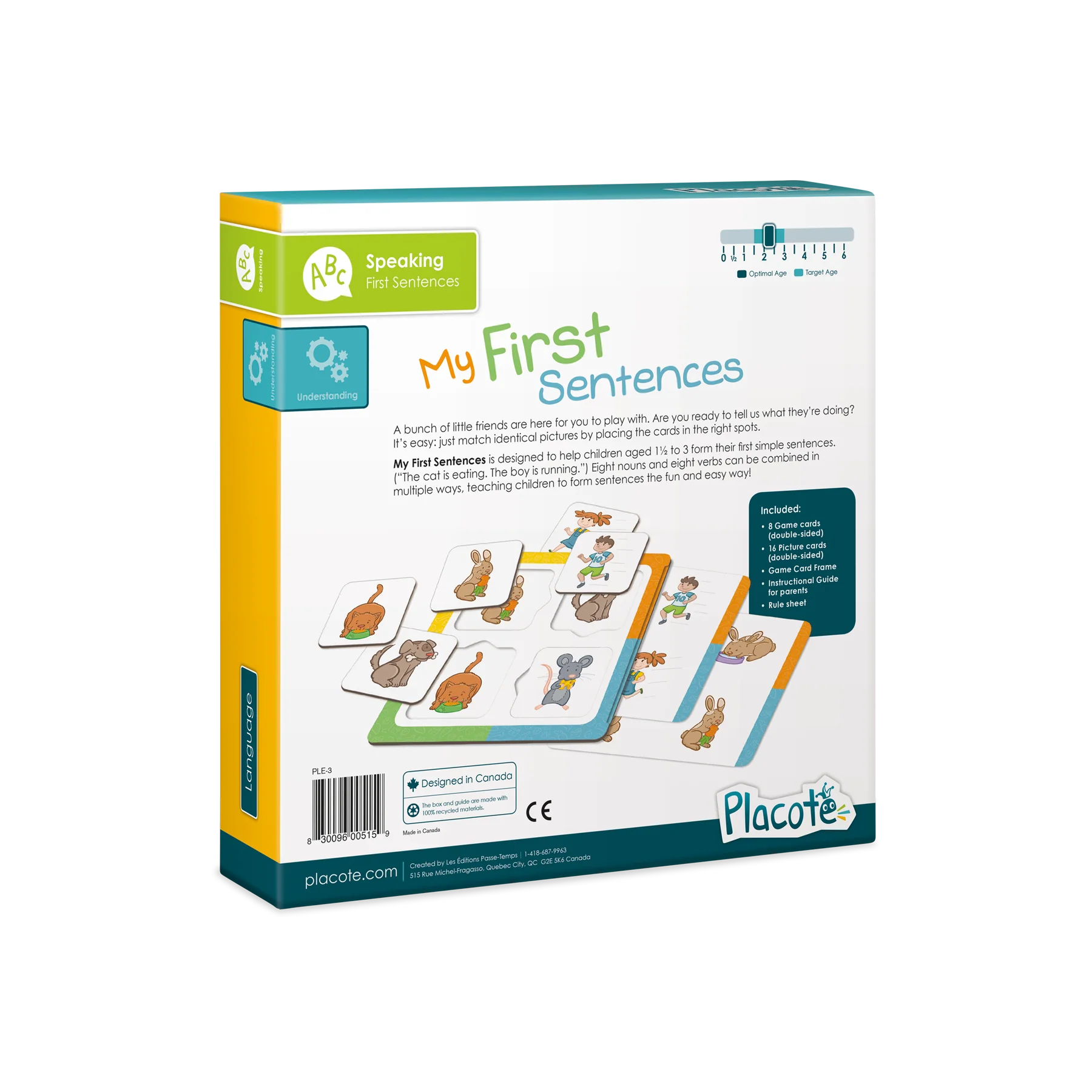 My First Sentences is designed to help children aged 1½ to 3 form their first simple sentences. (“The cat is eating. The boy is running”.) Eight nouns and eight verb can be combined in multiple ways, teaching children to form sentences the fun and easy way!